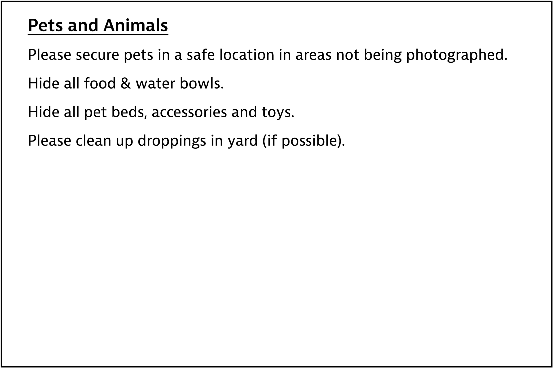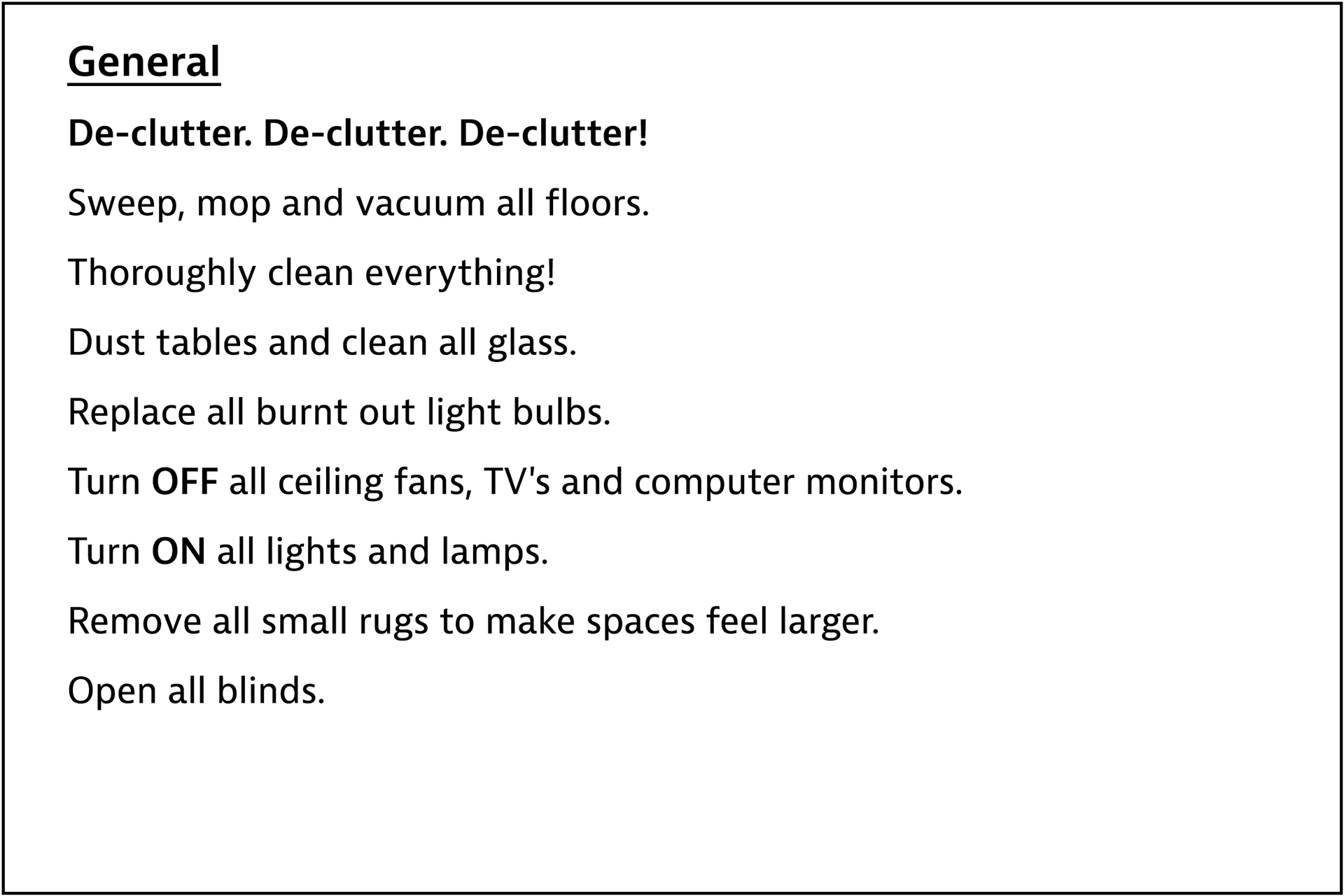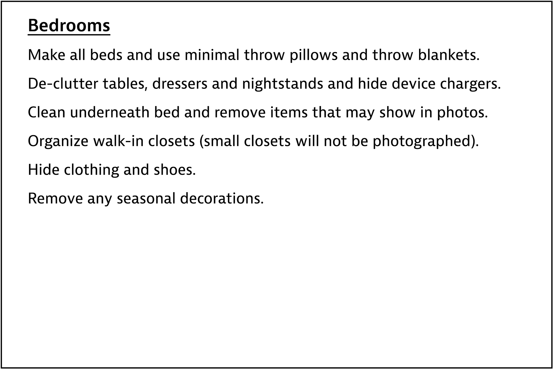 Please refer to the following checklists to ensure the photoshoot goes smoothly. In general, clean and staged homes sell faster than cluttered ones, as potential buyers are able to mentally furnish the listing without the distraction of a seller’s knickknacks and clutter. I need your help setting the table for a well-executed shoot. This is with your best interest at heart!