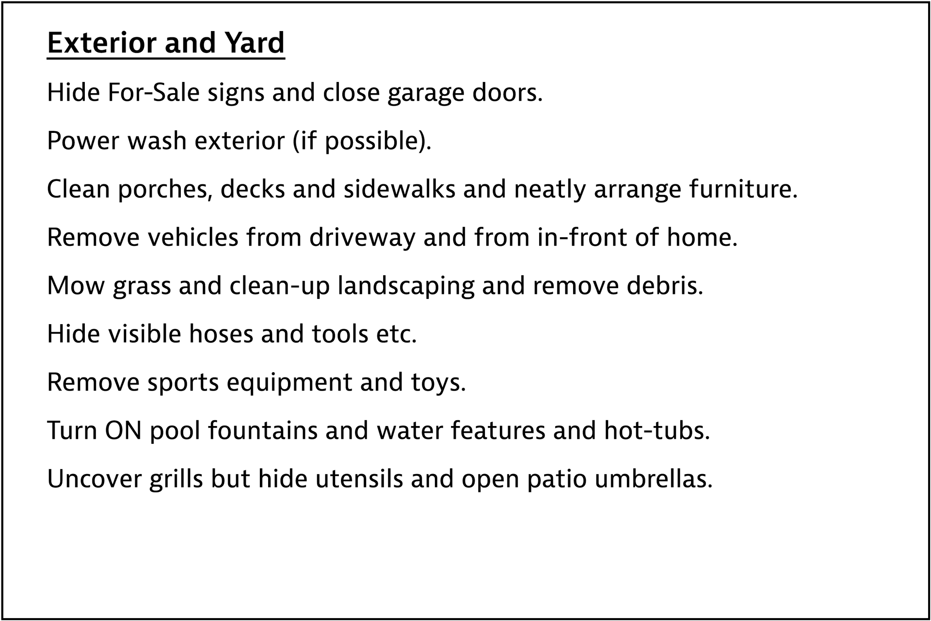 The home and property should resemble a vacation rental - free of clutter and personal items!