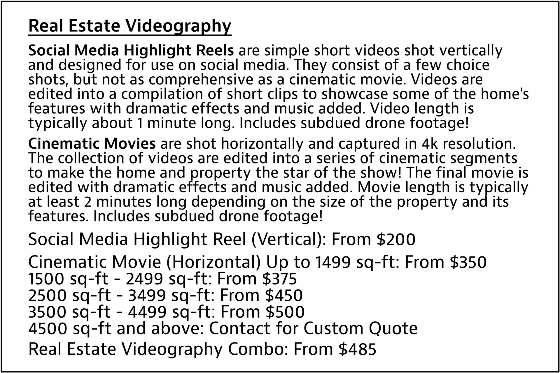 ****Prices subject to change without notice at the discretion of Rosser Architectural Media. Final and exact pricing will be confirmed upon invoicing.